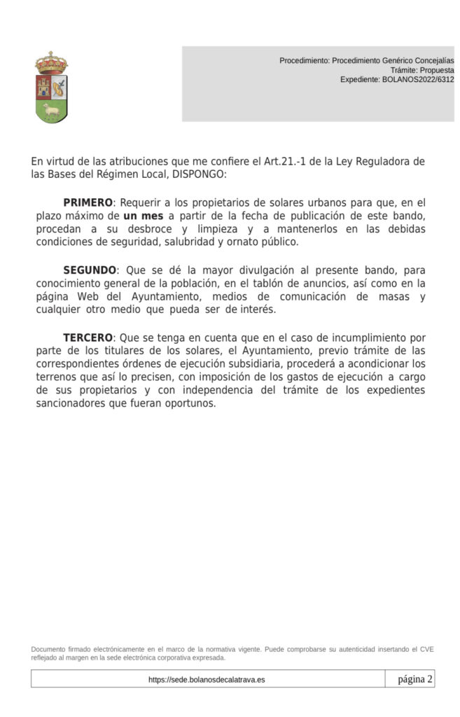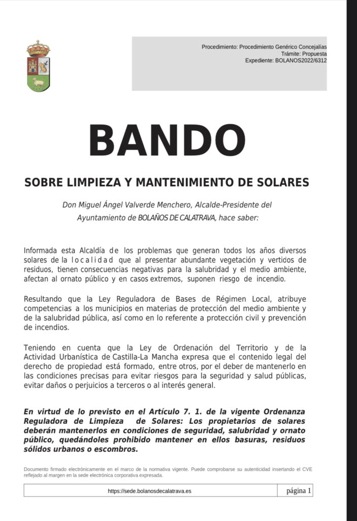 Bolaños Digital.- Ayer se hizo público el siguiente Bando de Alcaldía en el que informamos que, respecto a la limpieza y mantenimiento, diversos solares de la localidad presentan abundante vegetación y vertidos de residuos, que tienen consecuencias negativas para la salubridad y el medio ambiente, afectan al ornato público y en casos extremos, suponen riesgo de incendio; por lo que: