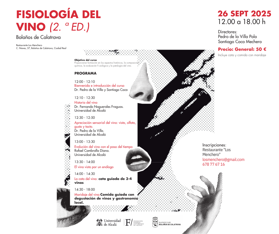 Este evento, que tendrá un coste de 50€ por persona, se llevará a cabo en el Restaurante “Los Menchero” de Bolaños de Calatrava, tiene como principal objetivo proporcionar formación en los aspectos históricos, la evaluación fisiológica y la patología del vino. Desde su primera edición, la Fisiología del Vino ha conseguido captar la atención del público, consolidándose como una referencia en el ámbito de la formación enología.