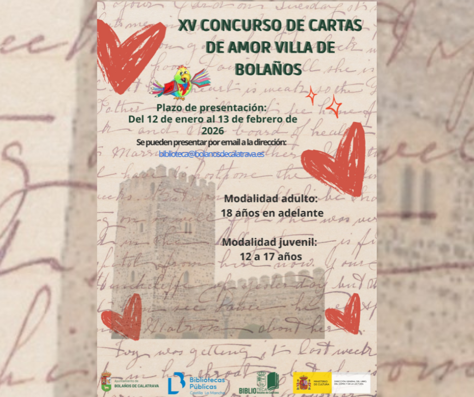 Bolaños Digital.- El Ayuntamiento de Bolaños, a través de su Concejalía de Cultura y la Biblioteca Municipal, ha anunciado la apertura de la convocatoria para el XV Concurso de Cartas de Amor “Villa de Bolaños”. Este certamen, que se ha consolidado como una cita ineludible en el calendario cultural de la localidad busca, un año más, premiar la sensibilidad y la destreza literaria de los participantes.