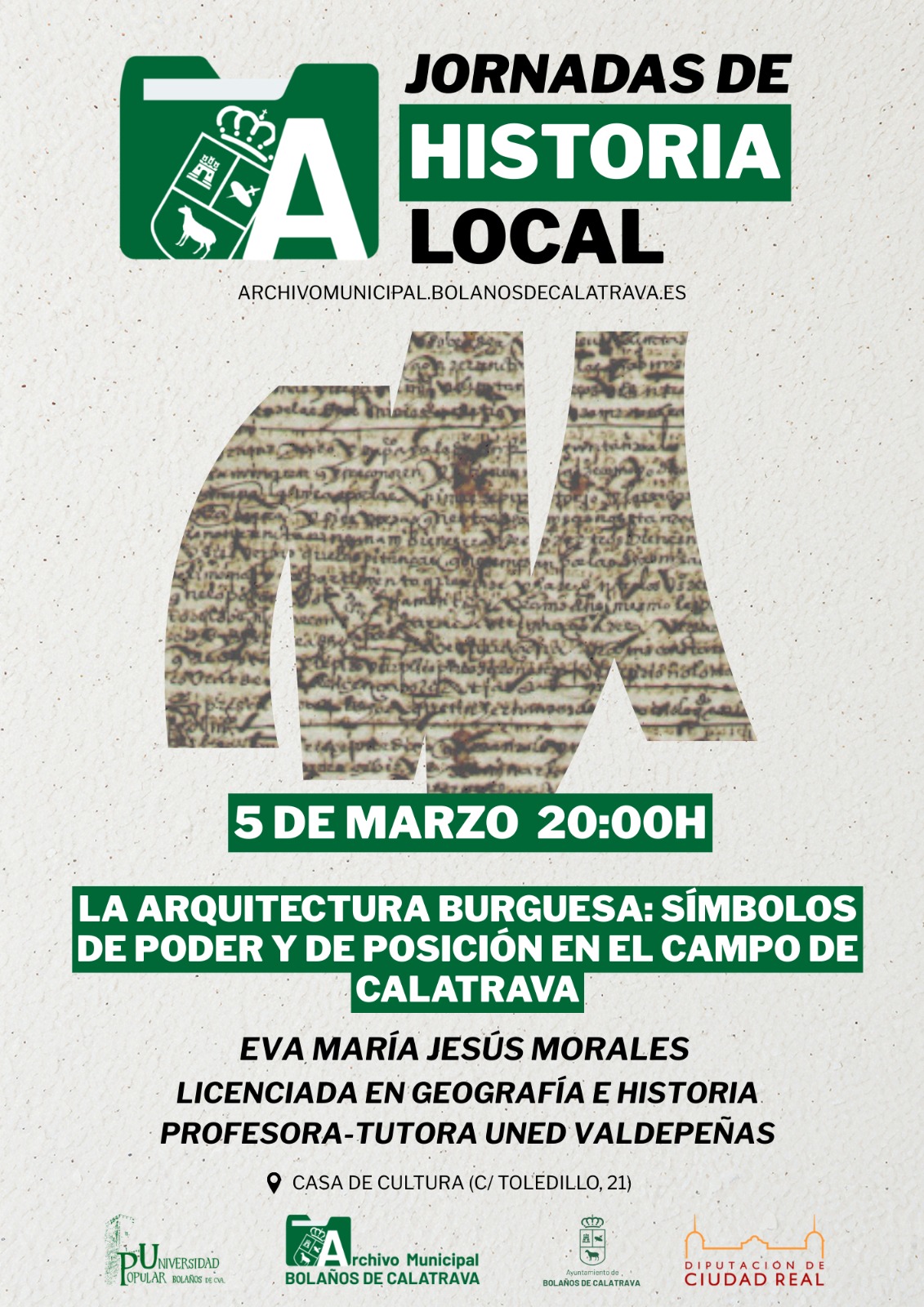 Bolaños Digital.- El Ayuntamiento de Bolaños de Calatrava continúa con su apuesta por la divulgación del patrimonio y la identidad local. Este jueves, 5 de marzo, las Jornadas de Historia Local regresan con una ponencia dedicada al urbanismo y la sociedad: “La arquitectura burguesa: símbolos de poder y de posición en el Campo de Calatrava”.