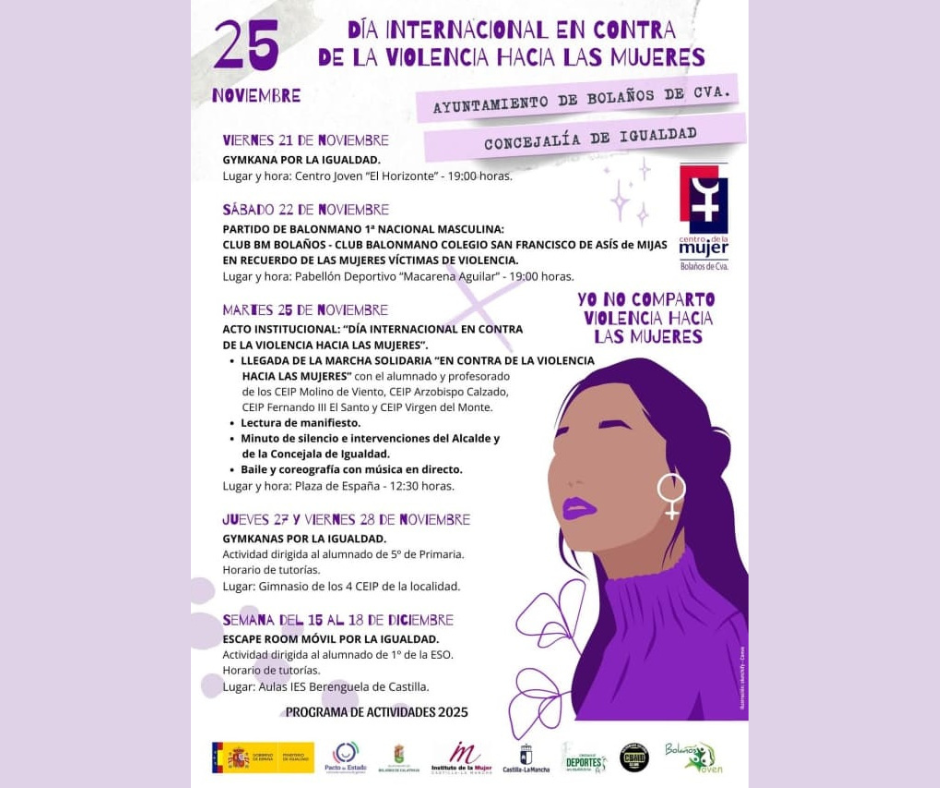 Bolaños Digital.- El Ayuntamiento de Bolaños de Calatrava, a través del Centro de la Mujer, ha preparado una extensa y variada programación con motivo del 25 de noviembre, Día Internacional de la Eliminación de la Violencia contra la Mujer, para sensibilizar a la comunidad sobre esta grave problemática y mostrar su compromiso con la lucha por la igualdad.