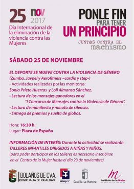 Con motivo del Día Internacional contra la Violencia de Género, Bolaños vuelve a presentar una serie de actividades entre las que destaca una jornada de actividades deportivas y la tradicional concentración silenciosa que se celebrará este año en la Plaza de España de la localidad, y durante la que se dará lectura a los textos ganadores del “I Concurso de Mensajes contra la Violencia de Género” y al manifiesto.