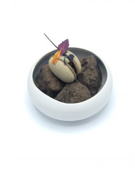 Cristina Ramírez de Arellano, afincada en Ciudad Real, ha realizado un homenaje a su tierra, con un macarón con polvo de boletus, relleno de un guiso de cordero manchego presentado sobre un parmentier de patata trufada, con productos autóctonos, que la devuelven a su infancia, al finalizar la vendimia donde toda la familia se reúne alrededor de la mesa, para saborear los guisos típicos manchegos.