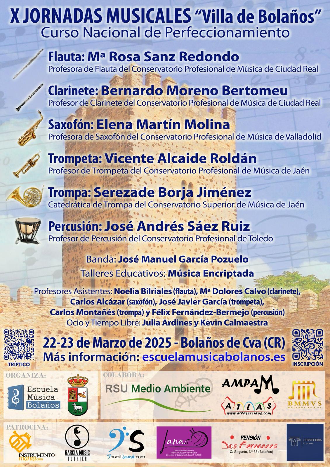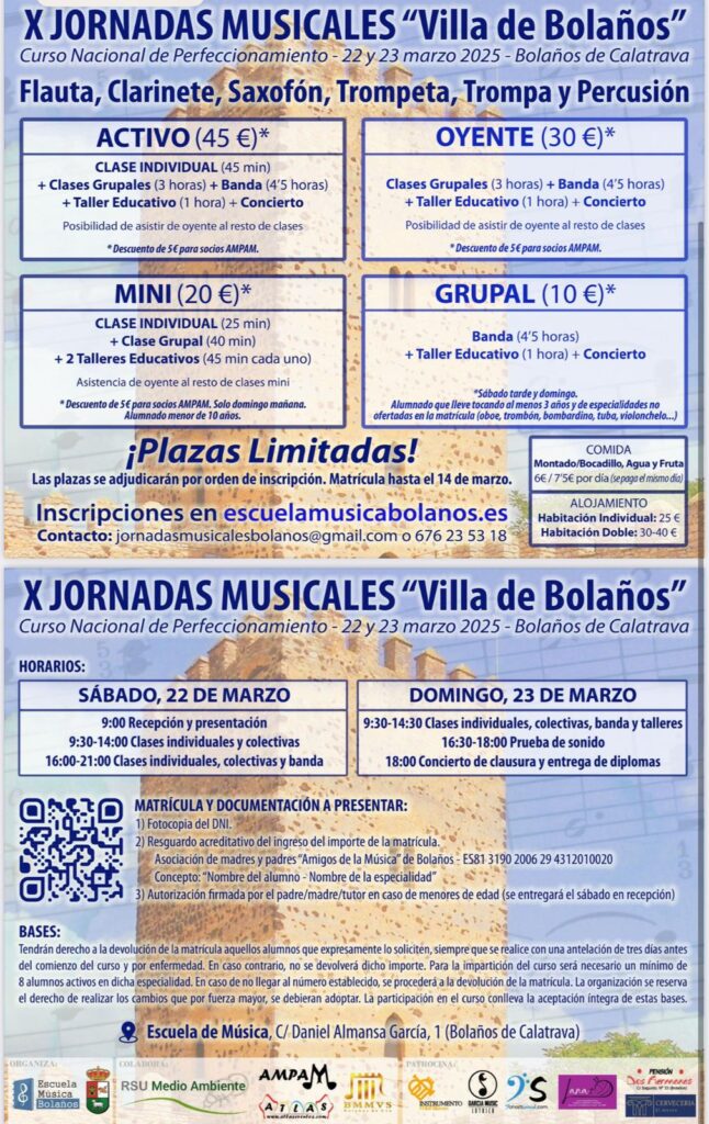 Las plazas son limitadas, por lo que se recomienda formalizar la inscripción cuanto antes a través de la página web escuelamusicabolanos.es. Para más información, los interesados pueden contactar a través del correo jornadasmusicalesbolanos@gmail.com o del teléfono 676 23 53 18.