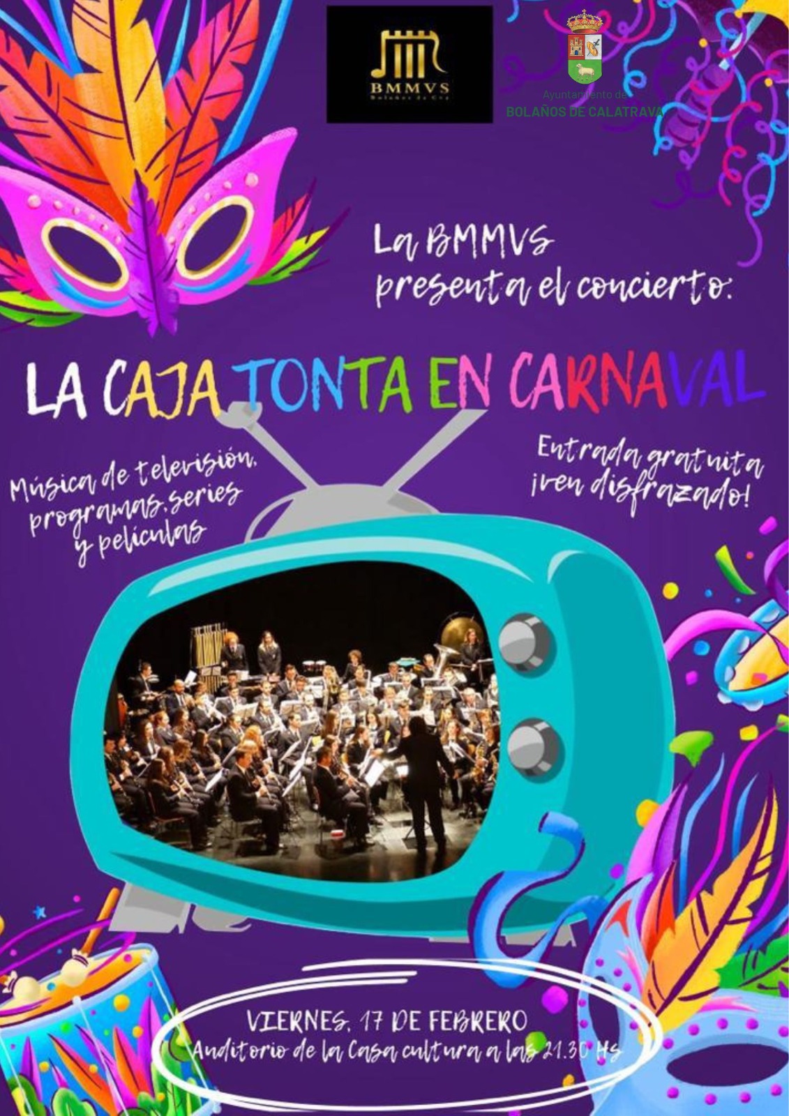 Ya entrada la noche, a las 21.30 horas en el auditorio de la Casa de Cultura, la Banda de Música Maestro Victor Sancho de Bolaños nos hará vibrar con su concierto de Carnaval bajo el título “La Caja Tonta en Carnaval”. En él viajaremos al pasado para revivir los temas musicales más emblemáticos del mundo del cine y la televisión. Desde la propia Banda de Música se anima “al publico a venir disfrazados y pasar una musical y divertida noche”.