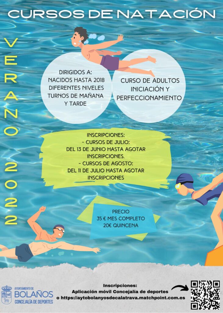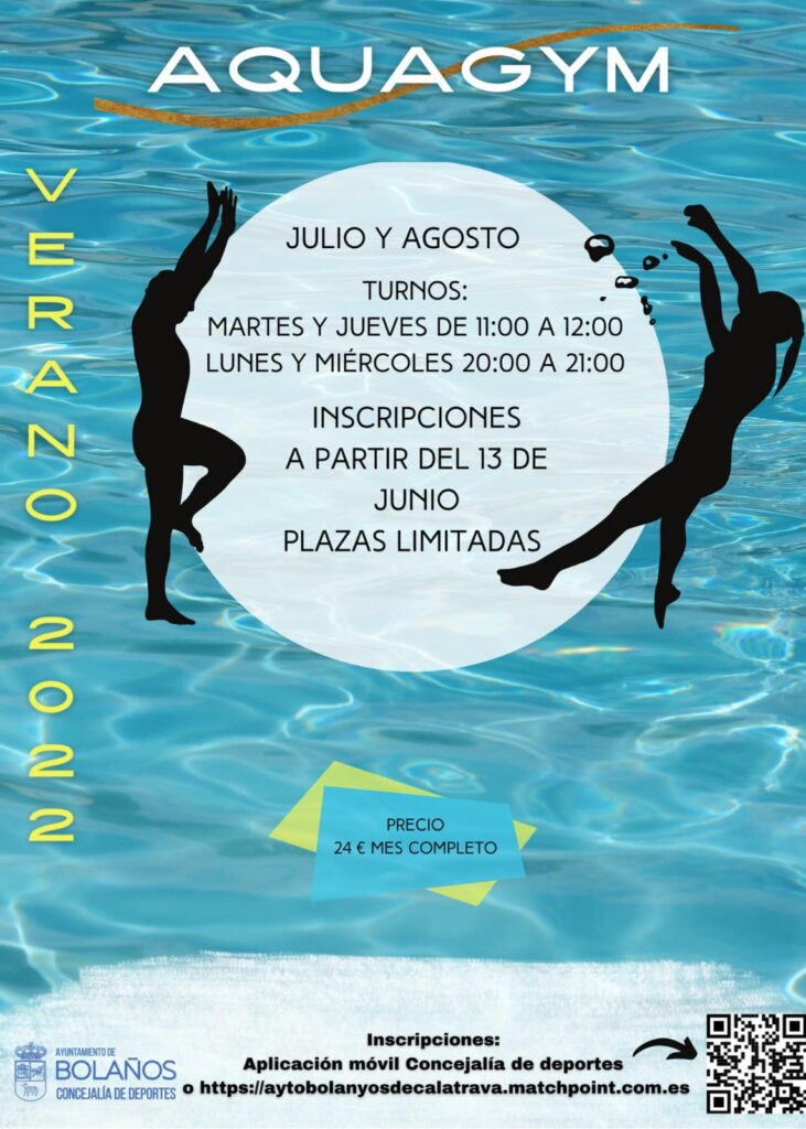 Desde este lunes ya está abierto el plazo de inscripción para ‘Aquagym’ y los ‘Cursos de iniciación y perfeccionamiento de natación’ de julio, mientras que para los de agosto el plazo se abrirá el próximo 11 de julio. Las inscripciones, que tendrán un coste de 24€ y 35€ respectivamente por mes completo y 20€ por quincena solo para natación, se realizarán a través de la aplicación móvil de la Concejalía de Deportes o a través de la página web www.aytobolanyosdecalatrava.matchpoint.com.es.