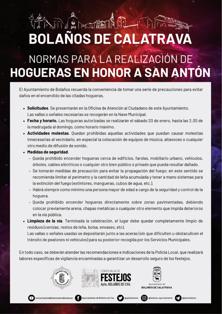 La hermandad de San Antón llevará a cabo, junto a autoridades locales, el encendido de su hoguera en el lugar de costumbre (recinto ferial). Asimismo, los bolañegos también podrán realizar sus hogueras vecinales particulares. Los interesados deberán presentar, previamente, en la Oficina de Atención al Ciudadano del Consistorio una instancia general solicitando la ubicación y realización de la misma, donde recibirán también las normas e indicaciones de la Policía Local para el correcto funcionamiento y organización.
