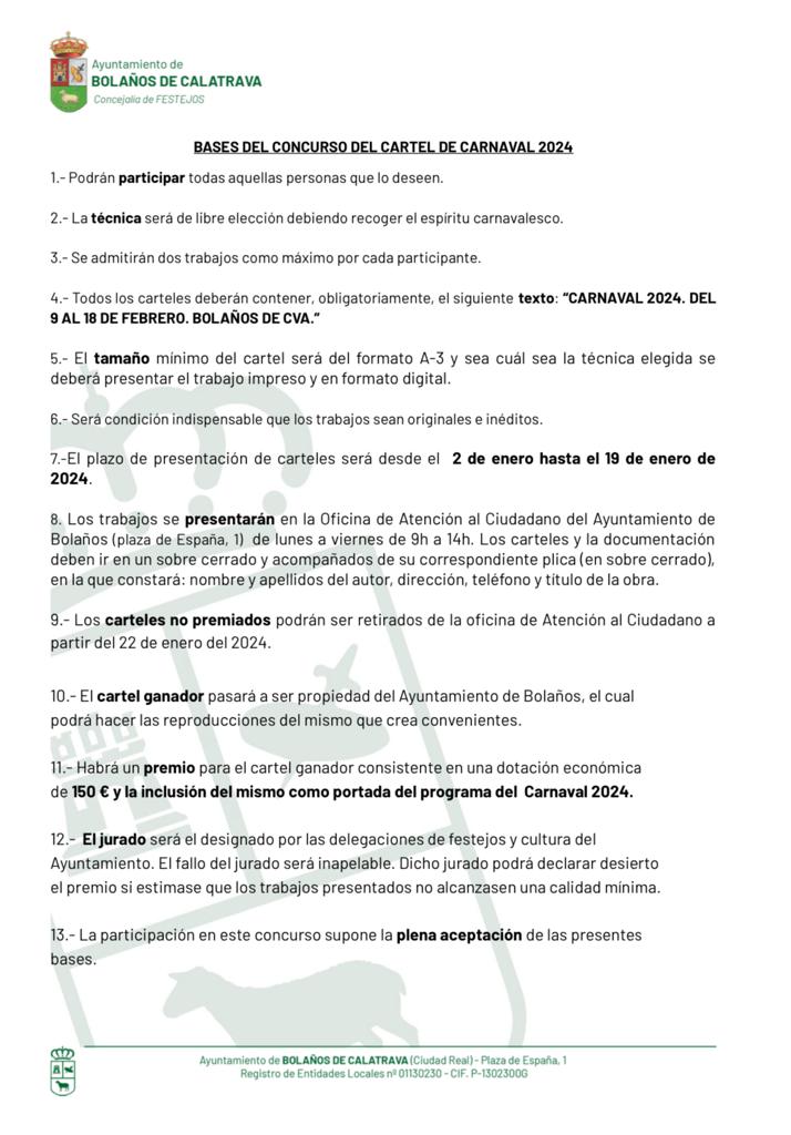 Cada cartel deberá ir acompañado de una plica en sobre cerrado que contenga: Nombre y apellido del autor, dirección, número de teléfono y título de la obra. Todos los carteles deben incluir obligatoriamente el siguiente texto: «CARNAVAL 2024. DEL 9 AL 18 DE FEBRERO. BOLAÑOS DE CVA.» Los trabajos se pondrán presentar hasta el próximo día 19 de enero. Se adjuntan las bases completas del concurso.