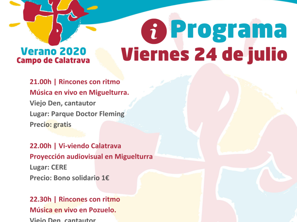 La programación de esta semana comienza el viernes 24 en Miguelturra, donde se proyectará el documental Vi-viendo Calatrava, a las 22 horas en el CERE. Previamente a las 21 h, el grupo ciudadrealeño Viejo Den, será el encargado de amenizar con su música esta localidad en el Parque Doctor Fleming. Después, la formación se desplazará hasta Pozuelo de Calatrava, para ofrecer un pequeño concierto en el Parque Municipal a las 22,30 horas. Un espectáculo acústico donde este grupo de más de 17 años de trayectoria, que ha compartido escenario con Javier Urquijo (Los Secretos) presentará varios de los temas de su  4º y 5º disco, con un estilo muy diverso que mezcla desde el rock latino de sus inicios, pasando al funk rock del espectáculo eléctrico actual, llegando a la música popular y folk, que nos recuerda al mítico grupo Jarabe de Palo.
