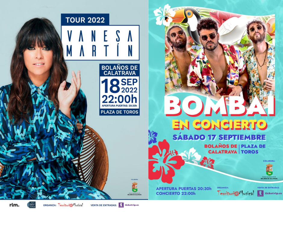 Bolaños Digital.– Bolaños de Calatrava acogerá en septiembre dos conciertos de artistas de primer nivel: Bombai, el sábado 17, y Vanesa Martín, el domingo 18. Así lo ha comunicado hoy el alcalde de Bolaños, Miguel Ángel Valverde, y la concejala de Festejos, Rocío Plata, encargados de la organización de los mismos con motivo de la celebración de la Feria y Fiestas del Cristo de la Columna que se celebran en la localidad del 13 al 18 de septiembre. Ambos conciertos comenzarán a las 22:00 horas en la Plaza de Toros de la localidad y la apertura de puertas se realizará una hora y media antes, a las 20:30 horas.